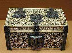 The Islamic art collection, the museum's newest, spans "thirteen centuries and three continents".[82] These exhibits, comprising ceramics, glass, metalware, wood, ivory, carpet, textiles, and miniatures, include more than 5,000 works and 1,000 shards.[83] Originally part of the decorative arts department, the holdings became separate in 2003. Among the works are the Pyxide d'al-Mughira, a 10th century ivory box from Andalusia; the Baptistery of Saint-Louis, an engraved brass basin from the 13th or 14th century Mamluk period; and the 10th century Shroud of Saint-Josse from Iran.[76][82] The collection contains three pages of the Shahnameh, an epic book of poems by Ferdowsi in Persian, and a Syrian metalwork named the Barberini Vase.[83]