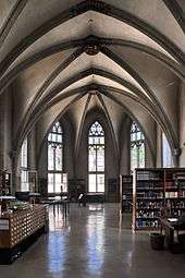 The choir had been used for secular purposes since the Reformation and transformed by the installation of shelves into a warehouse building. For several centuries it was used as a granary, and from 1873 to 1917, as the cantonal archives and as the University's library.[3] That so-called Zentralbibliothek (literally: Central Library) in the Predigern's choir passed over from the church to the University of Zürich to the "agreed plans for library purposes" according to the "Treaty between the Canton of Zürich and the City of Zürich regarding the establishment of a Central Library, from December 10, 1910". On 28 June 1914, the citizens of Zürich agreed to the establishment of the Zentralbibliothek, that was according to the plans by Hermann Fietz was built between 1914 and 1917, situated at the former site of the old monastery buildings. Because the wooden shelves were seen as a security risk, they were replaced in 1918/19 by a concrete construction, though already at that time there were objections against this plan. The book magazine built on the place of the old cloister, now directly connected to the Gothic choir and making the 1871 exemption for the time being reversed.[2][17] From 1917 to 1919, the final transformation of the choir to library purposes took place, and in 1919 the choir was leased to the Canton of Zürich,[2] and so the cantonal library was outsourced, however in 1919 moved back and again moved, to make room for the as of today Staatsarchiv des Kantons Zürich. Therefore, since 1982 the premise is used for the library, in particular for its Musikabteilung, meaning the music department of the University of Zürich.