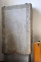 "Hie est sepultus frater Heinricus de Ruchenstein", buried as a member of the ministerially of the House of Rapperswil around 1300 AD, ledger stone made of Bollingen sandstone.[2][17]