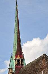The 27.1 metres (88.9 ft) high ridge turret of Predigerkirche, and its 96 metres (315 ft) clock tower in the background