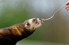 The European polecat's diet consists of mouse-like rodents, followed by amphibians and birds. Its most frequent prey item in the former Soviet Union is the common vole and rarely the red-backed vole. In large river floodlands, water vole are common prey. In spring and winter, amphibians (especially grass frogs and green toads) become important food items. Selective predation on male frogs by the polecat decreases the occurrence of polyandry in frog populations.[59] However, because amphibians have little calorific value, the polecat never grows fat on them, no matter how many it consumes. In Central Europe, the diet in winter months is dominated by birds including quail, grey partridges, grouse, chickens, pigeons and passerines. Seasonal changes in the activity rhythm is synchronised with the activity of the main prey.[60] Some species only rarely preyed upon by the polecat include European hedgehogs, asp vipers, grass snakes and insects.[8] In the British Isles, it commonly kills brown rats and European rabbits, and is capable of killing larger prey, such as geese and hares.[7] One polecat was reported to frequently wait at a riverbank and catch eels, which it took back to its burrow.[61] The polecat feeds on eels mostly during lengthy frosts when eels, unable to breathe air at regular intervals because of the ice, congregate at breathing holes. Unlike the stoat and weasel, the polecat readily eats carrion, including that of large ungulates.[62] The European polecat hunts its prey by stalking it and seizing it with its canine teeth, killing the animal with a bite to the neck. This killing method is instinctive, but perfected with practice. The polecat sometimes caches its food, particularly during seasonal gluts of frogs and toads.[63] Sometimes, the polecat does not kill these, but bites them at the base of the skull, thus paralyzing them and keeping them fresh for later consumption.[7] Though they are normally shy around humans, naturalist Alfred Brehm in his Brehms Tierleben mentions an exceptional case in which three polecats attacked a baby in Hesse.[58] During the winter period, when live prey is scarce, the European polecat may raid beehives and feed on the honey.[64]