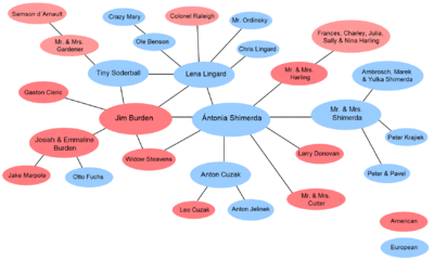 Minor characters include: Peter and Pavel, Ole Benson, Mr. and Mrs. Cutter, Widow Steavens, Larry Donovan, Anton Jelinek, Ántonia's children (Martha, Rudolph, Anna, Yulka, Ambrosch, Leo, Charley Jan, Lucie, Nina are named).