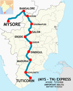 - Thoothukudi–Vanchi Maniyachi Junction–Virudhunagar Junction–Madurai Junction–Dindigul Junction–Karur Junction–Erode Junction–Salem Junction–Dharmapuri–Hosur–Bengaluru (Bengaluru City Junction and Cantonment railway station)–Mandya–Mysuru Junction.