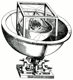 In terms of the impact of Mysterium, it can be seen as an important first step in modernizing the theory proposed by Nicolaus Copernicus in his "De Revolutionibus". Whilst Copernicus sought to advance a helio-centric system in this book, he resorted to Ptolemaic devices (viz., epicycles and eccentric circles) in order to explain the change in planets' orbital speed, and also continued to use as a point of reference the center of the earth's orbit rather than that of the sun "as an aid to calculation and in order not to confuse the reader by diverging too much from Ptolemy." Kepler regarded Copernicus' arguments as being merely a posteriori and set out to provide the a priori demonstrations of the astronomical phenomena.[6] Modern astronomy owes much to "Mysterium Cosmographicum", despite flaws in its main thesis, "since it represents the first step in cleansing the Copernican system of the remnants of the Ptolemaic theory still clinging to it." [7] Especially when dealing with the geometry of the universe, Kepler consistently utilizes Platonic and Neo-Platonic frameworks of thought. The entirety of the polyhedral idea is based on the same "formal cause" postulated by Plato for the structure of the universe. In addition, an "efficient cause" is need to answer the underlying reason for the structure. In an argument from design, Kepler postulates the existence and necessity of God the Creator as this "efficient cause."[8]