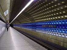 Náměstí Míru (Czech pronunciation: [ˈnaːmɲɛsciː ˈmiːrʊ], English: Peace Square) is a Prague Metro station on Line A. It is located in Vinohrady district under Korunní Street and has one exit through an escalator tunnel with a sub-surface vestibule under the plaza of the same name. The exit of the metro station is in the immediate vicinity of the Church of St. Ludmila and Vinohrady Theatre. The station was completed along with the first section of Line A in 1978 and served as a terminus for some time until the extension of Line A to Želivského station in 1980.