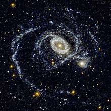NGC 1512 is a barred spiral galaxy approximately 38 million light-years away from Earth[2] in the constellation Horologium. The galaxy displays a double ring structure, with one ring around the galactic nucleus and another further out in the main disk. NGC 1512 is a member of the Dorado Group.[3]