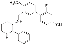 The compound CP-99994 was synthesized by replacing the quinuclidine ring with a piperidine ring and benzhydryl moiety by a benzyl group (figure 2).[13][18] CP-99994 had a high affinity for the human NK1 receptor and it started a great amount of structure–activity studies, each intending to identify the structural requirements for high-affinity interaction with the NK1 receptor, and to make the molecule even simpler and improve its chemico-physical and pharmacological properties.[18] CP-99994 eased dental pain in humans and entered phase II clinical trials; these were discontinued because of poor bioavailability. Pfizer researched several other related NK1 receptor antagonists. CJ-11974, also called ezlopitant, was a close analog of CP-96345 that had an isopropyl group on the methoxybenzyl ring. It was developed up to phase II clinical trials for chemotherapy-induced emesis before development was discontinued. CP-122721 was a CP-99994 analog that had a trifluoromethoxy group in the o-methoxybenzyl ring. It entered phase II trials for the treatment of depression, emesis and inflammatory diseases, but no further development has been reported.[13]