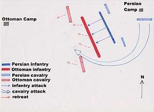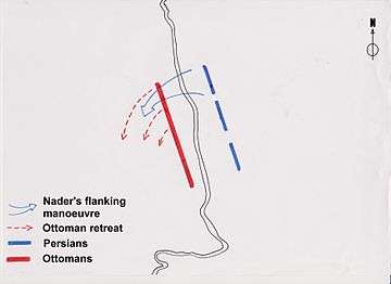 An intense musketry duel was kept up along the entire breadth of the line until Nader ordered his infantry unsheathe their sabres and charge the Ottomans, supporting them with a pincer movement by his cavalry reserve which put Topal Osman's army in a cauldron of Persian troops. The Turks crumbling in the face of this manoeuvre found that not even the presence of the old fox in the person of Topal Pasha could rally them and fled leaving all their guns.