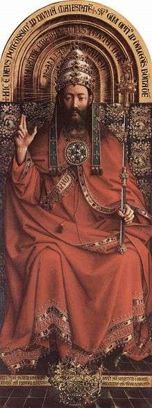 For Robert Rosenblum, Ingres's model was the figure of God the Father on the Ghent Altarpiece by Jan van Eyck, which was in the Louvre at the time Ingres painted this portrait.[3] The contemporary critic Pierre-Jean-Baptiste Chaussard compared Ingres's style in this portrait to that of Van Eyck (then known as Jean de Bruges):