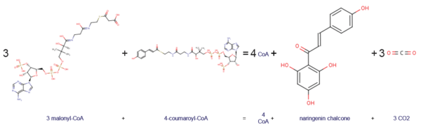 - ↑ Kreuzaler F, Hahlbrock K (November 1972). "Enzymatic synthesis of aromatic compounds in higher plants: formation of naringenin (5,7,4'-trihydroxyflavanone) from p-coumaroyl coenzyme A and malonyl coenzyme A". FEBS Lett. 28 (1): 69–72. doi:10.1016/0014-5793(72)80679-3. PMID 4646877.