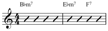 Slash notation is a form of purposefully vague musical notation which indicates or requires that an accompaniment player or players improvise their own rhythm pattern or comp according to the chord symbol given above the staff. On the staff a slash is placed on each beat (so that there are four slashes per measure in 4/4 time).[1]