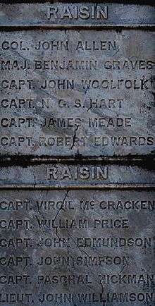 - ↑ "The Battle of River Raisin". Friends of the River Raisin Battlefield (RiverRaisinBattlefield.Org). Retrieved October 25, 2011.