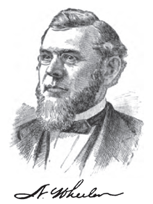 He was the son of David and Sarah (née De Forest) Wheeler and grandson of Deacon James and Mary (née Clark) Wheeler. The founder of his branch of the family, Moses Wheeler, born in Kent, England, was in New Haven, Conn., as early as 1641, and probably was one of the founders of that town. He removed, in 1648, to Stratford, Connecticut, where he carried on his trade of ship-carpenter. He also farmed, and kept the ferry across the Housatonic. He became an extensive landholder and died in 1698, aged 100 years. Sarah De Forest was descended from a Huguenot family, of Avesnes, France, some of whose members fled to Leyden, Holland, to escape persecution. In 1636 Isaac, son of Jessen and Marie (née Du Cloux) De Forest, emigrated from Leyden to New Amsterdam, and there married Sarah Du Trieux, who bore him 14 children. One of them, David, settled at Stratford. David Wheeler, father of Nathaniel, was a carriage manufacturer.[1]