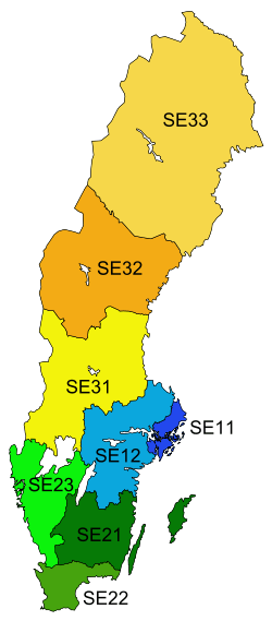 The 8 riksområden (Singular : Riksområde) includes the 21 counties of Sweden.[2] Only Stockholm (SE01) corresponds simply to the homonymous county.