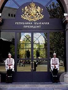 The National Guards Unit of Bulgaria (Bu:Национална гвардейска част на България) is a unique Bulgarian military regiment, it is a part of the Bulgarian Land Forces with the status of a special unit. The regiment ensures the security of the government and its treasures and guards the highest state officials. The National Guard performs the ritual "Ceremonial changing of the honor guard of the Presidency" for the first time on 5 November 2003 and every hour changes guard at the administrative building of the President of the Republic of Bulgaria. The Guard also ensures the security of civil, military and industrial sites in Sofia.[1] The scarlet hussar style uniform of the Guards was established in 1883 and includes elements of national symbolism. Throughout political changes, uniform details such as the eagle feather on the cap and the Alexander Star have been retained. The Alexander Star was originally a feature of the Bulgarian royal order "St. Alexander".[2]