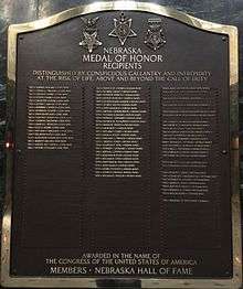 In 1969, the Nebraska State Legislature amended the Nebraska Hall of Fame statutes "to provide that Nebraskans awarded the Medal of Honor shall be named to the Hall of Fame" and required that the Hall of Fame Commission procure a plaque with the names of the Medal of Honor recipients.[15] On May 5, 1974, the State of Nebraska officially inducted 57 Nebraska Medal of Honor recipients to the Nebraska Hall of Fame.[16] The commission placed a bronze plaque by J.H. Matthews on the southwest pilaster of the Great Hall of the Nebraska State Capitol.[17]