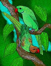 Hume has suggested that they have a common origin in the radiation of the Psittaculini tribe, basing this theory on morphological features and the fact that Psittacula parrots have managed to colonise many isolated islands in the Indian Ocean.[4] The Psittaculini may have invaded the area several times, as many of the species were so specialised that they may have evolved significantly on hotspot islands before the Mascarenes emerged from the sea.[9] A 2011 genetic study instead found that the Mascarene parrot (Mascarinus mascarinus) of nearby Réunion was most closely related to the lesser vasa parrot (Coracopsis nigra) from Madagascar and nearby islands, and therefore unrelated to the Psittacula parrots, undermining the theory of their common origin.[10]