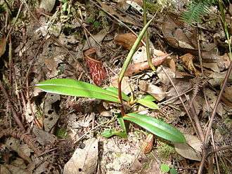 Despite there being only a very small number of known N. pitopangii specimens, the taxon is not thought to be of hybridogenic origin.[2][3] It is unlikely to be a natural hybrid involving N. glabrata since the closest known population of that species is more than 50 km from the type locality of N. pitopangii.[2] The only other Nepenthes from Sulawesi that produce infundibular upper pitchers are N. eymae and some forms of N. maxima. However, all recorded natural hybrids with these species exhibit petiolate leaves and typically have triangular lids with appendages on their lower surface.[2]