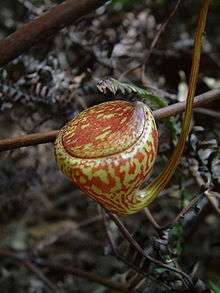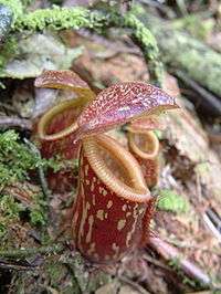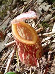 | An upper pitcher of Nepenthes pitopangii at the type locality in Lore Lindu National Park | |