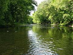 Neshaminy Creek /nᵻˈʃæmɪni/[1] is a 40.7-mile-long (65.5 km)[2] stream that runs entirely through Bucks County, Pennsylvania, rising south of the borough of Chalfont, where its north and west branches join.[1] Neshaminy Creek flows southeast toward Bristol Township and Bensalem Township to its confluence with the Delaware River. The name "Neshaminy" originates with the Lenni Lenape and is thought to mean "place where we drink twice".[3] This phenomenon refers to a section of the creek known as the Neshaminy Palisades, where the course of the water slows and changes direction at almost a right angle, nearly forcing the water back upon itself.[3] These palisades are located in Dark Hollow Park,[4] operated by the county, and are flanked by Warwick Township to the south and Buckingham Township to the north.[5][6]