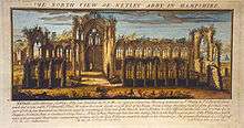 Keate was followed by other romantic poets including William Sotheby (Ode, Netley Abbey, Midnight, 1790).[58] Sotheby's view of the abbey was gothic; he peoples the ruins with spectral processions and ghostly Cistercians. Nor was he the only one; in 1795 Richard Warner wrote a potboiler entitled Netley Abbey, a Gothic Story in two volumes, featuring skullduggery at the abbey during the middle ages.[59] Dark deeds before the Dissolution also appeared in the section of Richard Harris Barham's Ingoldsby Legends (1847) covering Netley.[60] This complex satire pokes fun at the medieval church and the monks (whom he accuses of having walled up an erring nun in one of the vaults and ensuring God’s revenge upon them) and the tourists who crowded contemporary Netley, while at the same time showing appreciation of the beauty of the ruins.