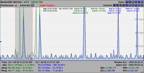 The following image depicts the interactive dynamic SVG/AJAX enabled Network Interface Bandwidth Monitor which is integrated into the NST WUI. Also shown is a Ruler Measurement tool overlay to perform time and bandwidth rate analysis.