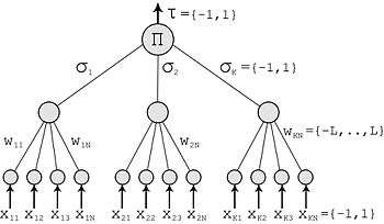It consists of one input layer, one hidden layer and one output layer. The number of neurons in the output layer depends on the number of hidden units K. Each hidden neuron has N binary input neurons: