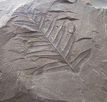 Fragments of the fronds are the most frequently found fossils of the Medullosales, and they have been widely used for biostratigraphy[19] and biogeographical studies.[20] Most are characterised by a major fork of the main rachis in the lower (proximal) part of the frond. Each branch produced by the fork has an essentially pinnate appearance, superficially resembling the fronds of many ferns, but it is now thought that they in fact consist of a series of more or less overtopped dichotomies.[21] Only one group of fronds, known as parispermacean fronds (fossil genera Paripteris and Linopteris), lacked this major dichotomy although they were still thought to have been constructed from a series of overtopped dichotomies.[22]
