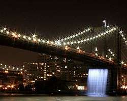 New York City Waterfalls is a public art project by artist Olafur Eliasson, in collaboration with the Public Art Fund, consisting of four man-made waterfalls placed around New York City along the East River. The most famous was at the Brooklyn Bridge in lower Manhattan. [1][2] At $15.5 million, it is the most expensive public arts project since Christo and Jeanne-Claude's installation of The Gates in Central Park.[2][3] The waterfalls officially began flowing on June 26, 2008. They ran from 7 am to 10 pm (under illumination after sunset), until October 13, 2008.