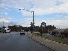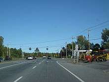 NY 254 begins at the southbound ramp of Adirondack Northway (I-87) exit 19[4] north of Glens Falls in the town of Queensbury. The route heads eastward from the interchange as Aviation Road, passing by many commercial buildings and Aviation Mall. As it passes along the north side of the mall, NY 254 curves to the southeast before veering back to the northeast ahead of an intersection with the four-lane US 9 (Upper Glen Street). The route continues past US 9;[5] however, maintenance of the highway is transferred from the New York State Department of Transportation (NYSDOT) to Warren County at the US 9 junction. Now co-designated as CR 47,[6] NY 254 progresses eastward along the four-lane Quaker Road, serving as a northerly bypass of the city of Glens Falls.[5]