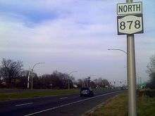 New York State Route 878 (NY 878) is a state highway in the U.S. state of New York, forming the Nassau Expressway. The route exists in two sections connected by Rockaway Boulevard and Rockaway Turnpike, maintained in part by New York City, the New York State Department of Transportation (NYSDOT) (as NY 909G), and Nassau County.[4][5] The termini of the combined route are the Belt Parkway and Conduit Avenue (NY 27) in Ozone Park, southern Queens, and the Atlantic Beach Bridge in Lawrence, southwestern Nassau County.