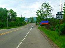 The segment of modern NY 305 north of Cuba was originally the southernmost portion of Route 16, an unsigned legislative route assigned by the New York State Legislature in 1908. At Belfast, Route 16 continued north on what is now NY 19.[6][7] The Cuba–Belfast section of legislative Route 16 was assigned a posted route designation as part of the 1930 renumbering of state highways in New York when it was designated as the northern half of NY 94, which continued south through Cuba to NY 17 (now NY 417) in Portville. At the same time, what is now NY 45 in Rockland County was designated as NY 305.[2][8] The NY 94 and NY 305 designations were swapped in the early 1940s, placing NY 305 on its current alignment from Portville to Belfast.[3][4] South of Portville, what is now NY 305 was originally designated as part of NY 16 c. 1931.[2][9] It was added to NY 305 c. 1963 when NY 16 was rerouted south of Olean to follow what had been NY 16A.[10][11]