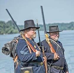 According to a number of historical sources, Newburgh was a prominent stop on the Underground Railroad between the mouth of the Little Pigeon River and Lake Michigan.[11] On July 18, 1862, Newburgh was the first town north of the Mason-Dixon line to be captured by the Confederate forces during the American Civil War in what would come to be known as the Newburgh Raid. Colonel Adam "Stovepipe" Johnson, with a partisan band, crossed the Ohio River and confiscated supplies and ammunition without a shot being fired.[12] The Confederates would have been unable to shell the city (as promised) had Newburgh put up a fight. The Confederates' "cannons" were an assemblage of a stove pipe, a charred log, and wagon wheels. The raid convinced the federal government that it was necessary to supply Indiana with a permanent force of regular Union Army soldiers to counter future raids.[13] Many of the structures used in this raid are still standing, including The Exchange Hotel.