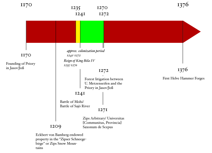 Any official documents regarding the founding of Metzenseifen have yet to be found and were likely destroyed in the Counter-Reformation. Much of the historical records obtained regarding the history of Medzev come from the monastery in Jasov. As shown in the timeline, the departure of the Mongols in 1241 prompted King Béla IV to rebuild Hungary as quickly as possible. It is known that he invited Germans as part of his recolonization effort. Whether he directly invited the particular settlers of Metzenseifen remains unknown, but possible. The first official document from the Bodva Valley is that of a legal document from 1272, which describes the litigation of forestry rights between Vyšný Medzev/Upper Metzenseifen and Jasov. It could be extrapolated that Metzenseifen was founded sometime between 1241 and 1272.[3]