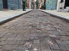 Remnants of Nicolson pavement still exist in several cities across the US. Incorrectly touted as the only remaining wooden street in the US, Roslyn Place in Pittsburgh, Pennsylvania, is completely paved in wooden blocks.[4][5] In addition, patches of creosoted wooden block pavement are still visible in an alley along 10th street between Olive and Locust Streets in St. Louis, Missouri,[6] and at least three other alleys in Chicago, Illinois still retain the use of wood block pavement, though some are in states of disrepair.[7] The 200 block of Camac Street in Philadelphia, Pennsylvania is also paved with wooden blocks, and it is regularly maintained having been listed in the Philadelphia Register of Historic Places.[8] Hessler Court in Cleveland, Ohio, known for its Hessler Street Fair, likewise maintains its Nicolson Pavement for historic reasons.[9]