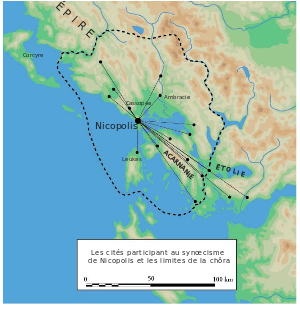 Nicopolis (Greek: Νικόπολις Nikópolis, "City of Victory") or Actia Nicopolis was the capital city of the Roman province of Epirus Vetus. It was located in the western part of the modern state of Greece. The city was founded by Caesar Augustus in commemoration of his victory in 31 BC over Antony and Cleopatra at the Battle of Actium nearby. It was soon made the major city of the wider region of Epirus region. Many impressive remains of the ancient city may be visited today.