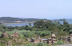 The ruins of Nicopolis,[11] now known as Palaea Preveza ("Old Preveza"), lie about 5 km north of the town, on a small bay of the Gulf of Arta (Sinus Ambracius) at the narrowest part of the isthmus of the peninsula which separates the Gulf from the Ionian Sea. Besides the Acropolis, the most conspicuous features are: