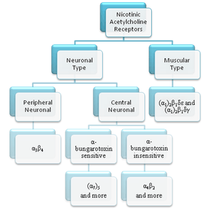 nAChRs are cholinergic receptors found in the central nervous system (CNS), peripheral nervous systems (PNS) and skeletal muscles, these receptors are ligand-gated ion channels with binding sites for acetylcholine and other molecules. When ACh or other agonists bind to the receptors it stabilizes the open state of the ion channel allowing influx of cations such as potassium, calcium and sodium ions. The nAChRs are made up by different subunits which determine the quaternary structure of the receptor, those subunits are α subunits (α1−α10), β subunits (β1−β4), one δ subunits, one γ subunit and one ε subunit. nAChRs can be either heteromeric or homomeric. The heteromeric receptors found in the central nervous system are made up by two α subunits and three β subunits with the binding site at the interface of α and the adjacent subunit. These receptors contain two binding sites per receptor and have different affinity for chemicals based on the composition of subunits. Both binding sites work together and thus, both sites need to be occupied with a nAChR agonist so that channel activation can take place.[8] nAChRs containing α2−α6 and β2−β4 subunits have been shown to have higher affinity for ACh than other receptors. Homomeric receptors contain 5 identical subunits, they have 5 binding sites located at the interface between two adjacent subunits. In the year 2000 two homomeric receptors had been identified in humans, the α7 and α8 receptors.[7][9][10][11]