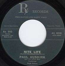 The recording of the song was turned down by Pappy Daily, who did not consider the song country. Nelson, who owed Daily the recording of other songs, had sold the "Night Life" for enough money to master the record on another studio. Daily threatened Nelson to sue him if he pressed the song.[3] Nelson and Buskirk took the tape from Gold Star Studios, and went to Bill Holford's ACA Studios to master the recording.[5] The song was recorded as "Nite Life", and the artist labeled under "Paul Buskirk and the Little Men featuring Hugh Nelson".[3] Released through Rx Records, few copies of the single were pressed,[5] while it received limited airplay by DJ Uncle Hank Craig on XEG.[6]