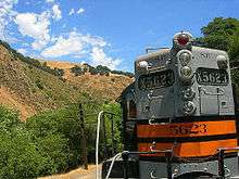 The Niles Canyon Railway (NCRy) is a heritage railway running through Niles Canyon, between Sunol and the Niles district of Fremont in the East Bay of the San Francisco Bay Area, in California, United States. The railway is listed on the National Register of Historic Places as the Niles Canyon Transcontinental Railroad Historic District.[1] The railroad is operated and maintained by the Pacific Locomotive Association which preserves, restores and operates historic railroad equipment. The NCRy features public excursions with both steam and diesel locomotives along a well-preserved portion of the First Transcontinental Railroad. The Golden Gate Railroad Museum moved its collection from San Francisco to the NCRy in 2007 for storage and limited operations after their home at Hunters Point Naval Shipyard was shutdown for redevelopment.