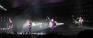 The Year Zero project included an alternate reality game of the same name, with much of the game revolving around various live shows. During a Nine Inch Nails concert in Lisbon, Portugal, a USB flash drive was found in a bathroom stall containing a high-quality MP3 of the track "My Violent Heart", a song from the then-unreleased album.[48] A second USB drive was found after a concert in Barcelona, containing the track "Me, I'm Not".[49] Following the release of Year Zero the focus of the tour shifted towards debuting and promoting tracks from the new album. While some of these songs were performed by all 5 band members as conventional guitar-driven rock songs, two of them ("Me, I'm Not"[50] and "The Great Destroyer"[51]) were played by Reznor, guitarist North and keyboard player Cortini as a 3 piece, using a combination of live guitars and pre-programmed samples triggered onstage with computers and manipulated in real time using Ableton software.[52]