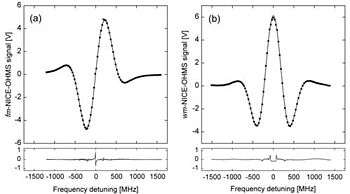Some typical Doppler-broadened NICE-OHMS signals, from 13 ppb (10 μTorr, 13•10−9 atm) of C2H2 detected in a cavity with a finesse of 4800, are shown in the figure. (a) fm- and (b) wm-signal. Individual markers: measured data; Solid curves: theoretical fits.