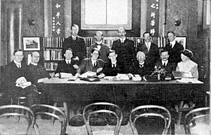 front row (L to R): C.H. Norman, Alfred Salter, Aylmer Rose, Fenner Brockway, Clifford Allen, Edward Grubb, Will Chamberlain, Catherine Marshall.