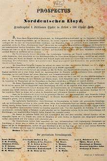 The German shipping company North German Lloyd (NDL) was founded by the Bremen merchants Hermann Henrich Meier and Eduard Crüsemann on 20 February 1857, after the dissolution of the Ocean Steam Navigation Company, a joint German-American enterprise.[1][2][3][4][5] The new shipping company had no association with the British maritime classification society Lloyd's Register; in the mid-19th century, "Lloyd" was used as a term for a shipping company[6] (an earlier user of the term in the same context was the Trieste-based Österreichischer Lloyd).