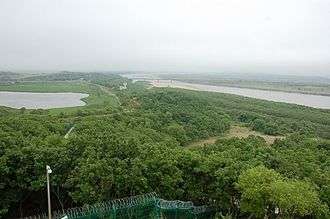 The principal border treaty was signed on April 17, 1985.[3] A separate, trilateral treaty specifies the position of the tripoint of the borders of Russia, North Korea, and China.[4] The North Korea–Russia and China–North Korea borders run along the middle of the Tumen River, while the China–Russia border approaches the junction point overland from the north. Because the theoretical tripoint is in the middle of the river, where it would be impractical to install a border monument, the agreement provides instead that the three countries install border monuments on the riverbank, and that the position of the tripoint be determined with respect to those monuments.[4]
