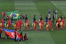 2010 was North Korea's first appearance at the World Cup since 1966.[11] The draw placed North Korea in Group G. They played their first match against five-time winners Brazil on 15 June, with Brazil winning 2–1 in a game where North Korea was well organized defensively and showed resilience, frustrating the Brazilians. Despite their best efforts, they were nevertheless outmatched and eventually broken down. Maicon's relief was visible after his goal to finally put Brazil ahead.