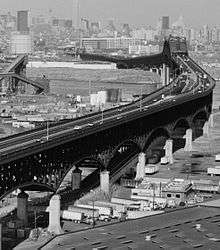 The fore-runner of Port Authority of New York and New Jersey was established on April 30, 1921.[19] Huge transportation projects opened between the wars: The Holland Tunnel in 1927, The George Washington Bridge in 1931, The Bayonne Bridge in 1931, and The Lincoln Tunnel in 1937, allowing vehicular travel between New Jersey and New York City to bypass the waterfront. Hackensack River crossings, notably the Pulaski Skyway, were also built. Newark Airport was the first major airport in the New York Metropolitan Area, opening on October 1, 1928. At Houvenkopf Mountain crosses were burned by the Ku Klux Klan. Radburn was founded in 1929 as "a town for the motor age".[20][21] The Kearney Works of Western Electric kept the plant running with "make work" program,[22] similar to WPA projects.