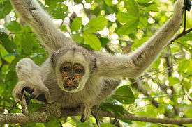 The northern muriqui (Brachyteles hypoxanthus) is an endangered muriqui (woolly spider monkey) species endemic to Brazil. It is unusual among primates in that it shows egaliterian social relationships.[3] It is found in the Atlantic Forest region of the Brazilian states of Rio de Janeiro, Espírito Santo, Minas Gerais and Bahia. Muriquis are the largest species of New World monkeys. The northern muriqui can grow up to 4.3 ft tall. It feeds mainly on leaves and twigs, but will also eat fruit. It often hangs upside-down by its prehensile tail while eating.