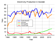 Electricity production in Sweden is dominated by nuclear power and hydroelectricity which currently make about equal contributions to energy production, for which demand has remained fairly constant since 1990.