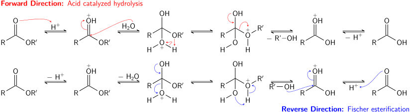 Acid-catalyzed hydrolysis of esters is also an equilibrium process – essentially the reverse of the Fischer esterification reaction. Because an alcohol (which acts as the leaving group) and water (which acts as the nucleophile) have similar pKa values, the forward and reverse reactions compete with each other. As in transesterification, using a large excess of reactant (water) or removing one of the products (the alcohol) can promote the forward reaction.